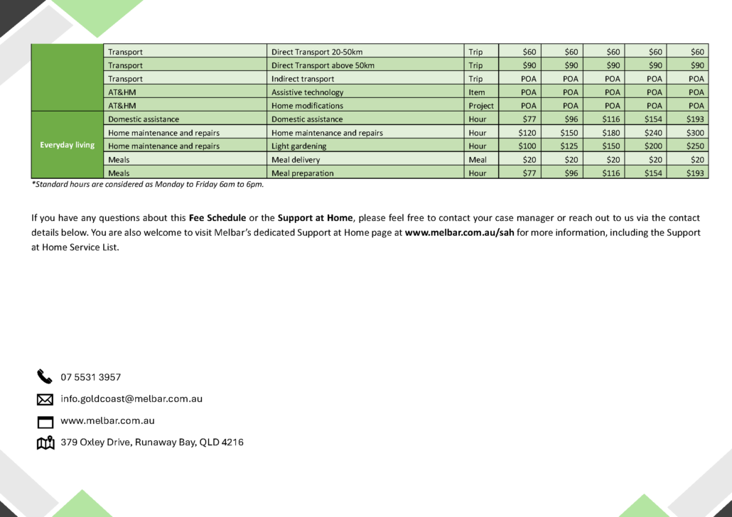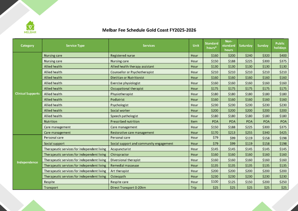 Melbar Gold Coast Fee Schedule