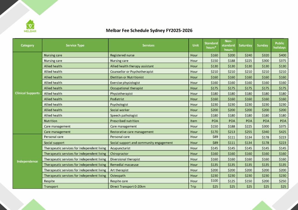 Melbar Sydney Fee Schedule